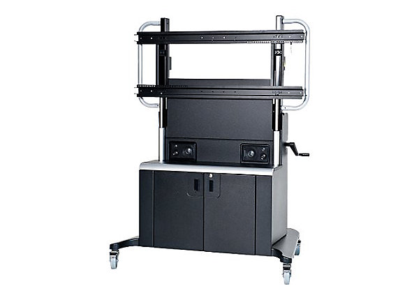 This mobile floor stand is height adjustable by 15" (38 cm) up and down, and includes integrated speakers, a locking cabinet to secure equipment, casters that swivel and lock for easy movement, and a cabling and power-distribution system for the display and connected peripherals. View specifications.