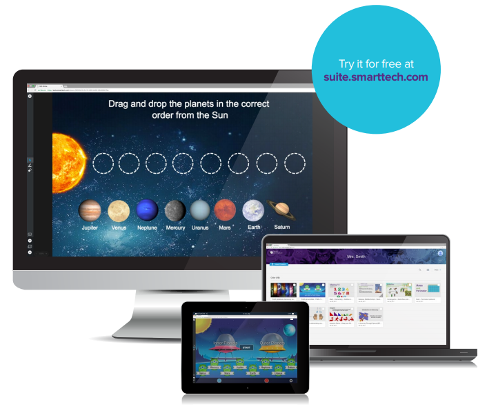 SMART Learning Suite Online lets teachers open SMART Notebook lessons anywhere, and share them to any student device. With lessons on phones, tablets and PCs, students complete interactive assignments – and learn at their own pace. Teachers also gain valuable insights with real-time formative assessments. It’s a whole new way to spark active learning and encourage your students to challenge themselves.